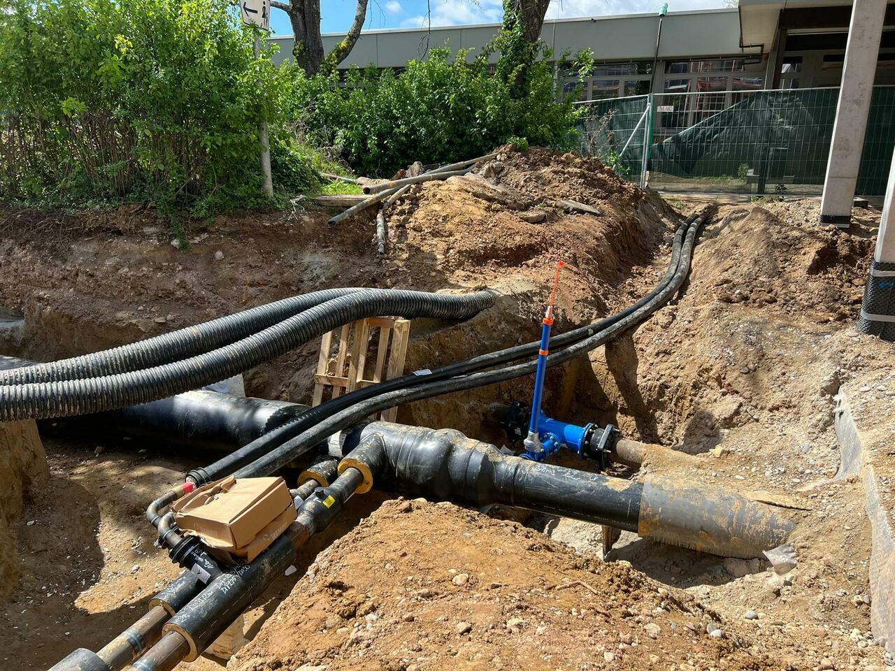 Bereits 2024 wurden erste Wärmeleitungen auf dem Schulcampus verlegt. Aktuell läuft der Fördermittelantrag beim BAFA für den weiteren Ausbau des Nahwärmenetzes. Ziel ist es, die Bewilligung zum Ende des zweiten Quartals 2025 zu erhalten, um mit der Umsetzung unmittelbar zu starten. Mittlerweile sind drei Brunnen (2x Grundwasser, 1x Erdwärmebohrung) gebohrt. Weitere zwei Brunnenbohrungen sollen in Kürze folgen. Die direkte Nutzung/Abkühlung des Grundwassers ist ein innovativer Bestandteil des Wärmenetzes.
