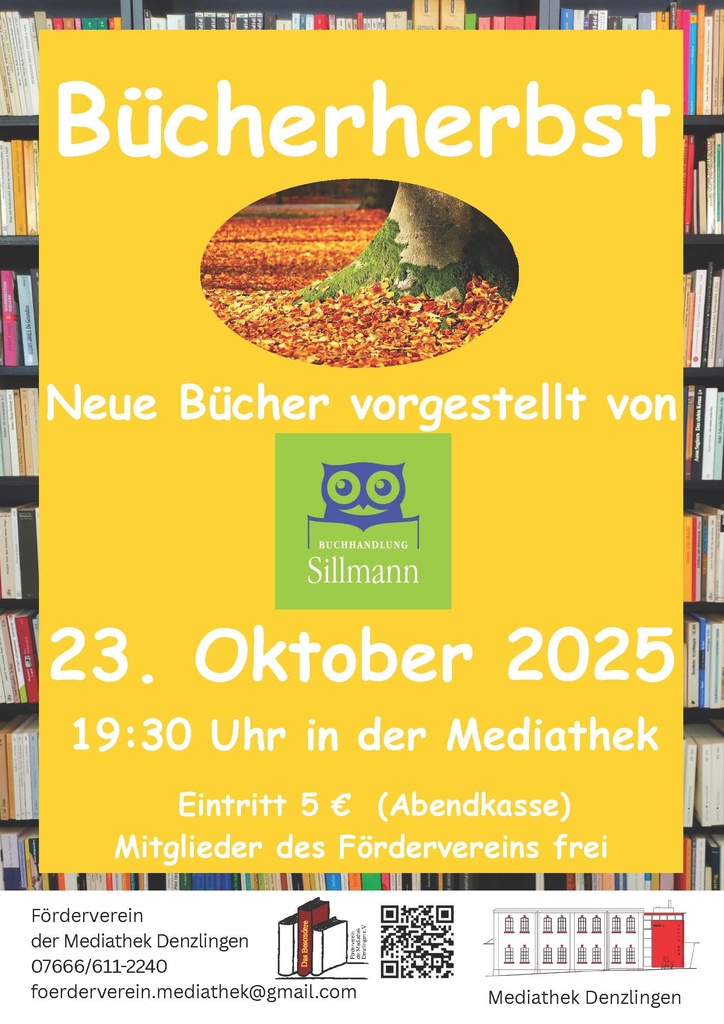Wer Lesestoff für graue Herbst- und Wintertage sucht, wird am Donnerstag, 23. Oktober um 19.30 Uhr in der Mediathek Denzlingen fündig. Auf Einladung des Fördervereins der Mediathek stellt das Team der Buchhandlung Sillmann Lieblingstitel der herbstlichen Neuerscheinungen vor. Der Förderverein sorgt für den gemütlichen Rahmen. Eintrittskarten kosten 5€ pro Person und sind an der Abendkasse erhältlich. Fördervereinsmitglieder genießen freien Eintritt.