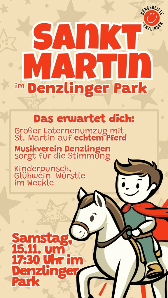 Schon bei der Premiere kamen über 500 Besucherinnen und Besucher. Auch diesmal dürfen sich kleine und große Laternenläufer auf einen unvergesslichen Herbstabend freuen: mit St. Martin hoch zu Ross, musikalischer Begleitung durch den Musikverein Denzlingen und einer besonderen Atmosphäre voller selbstgebastelter Laternen und herbstlichem Flair.