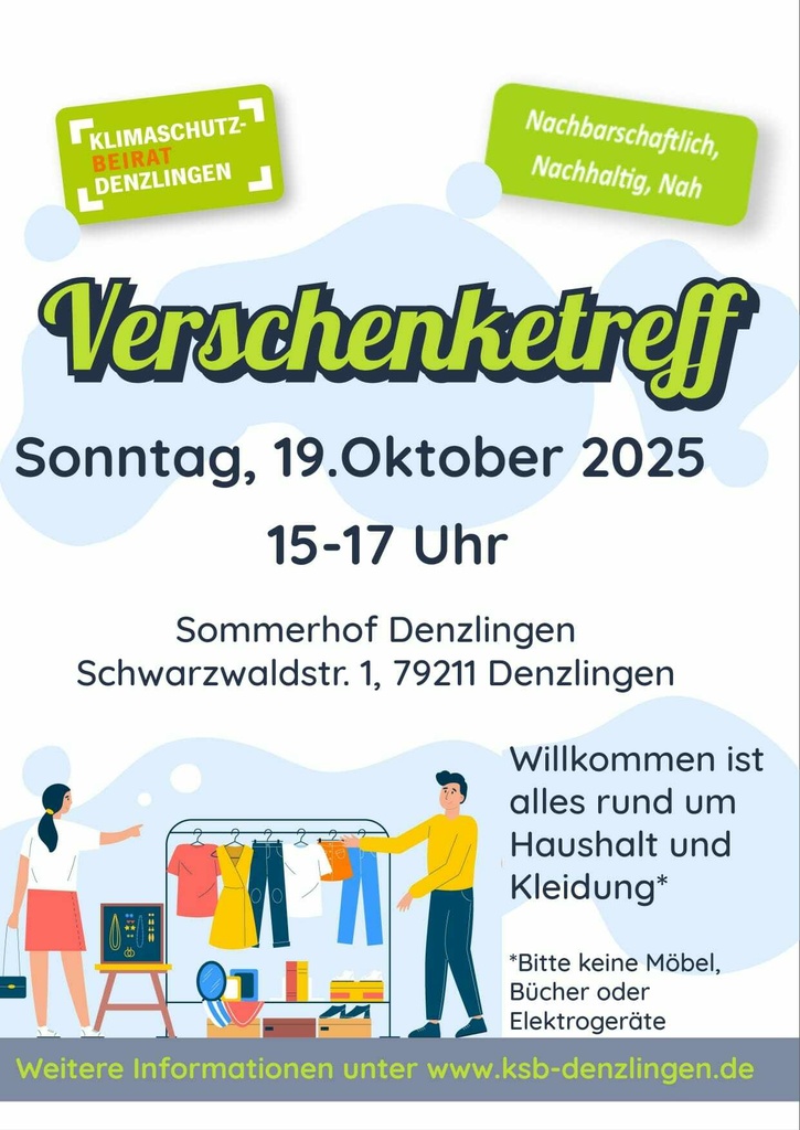Diesen Sonntag, den 19.10. von 15 – 17 Uhr, veranstaltet der Klimaschutzbeirat Denzlingen wieder einen Verschenketreff im Quartierstreff Sommerhof, Schwarzwaldstraße 1, Denzlingen.