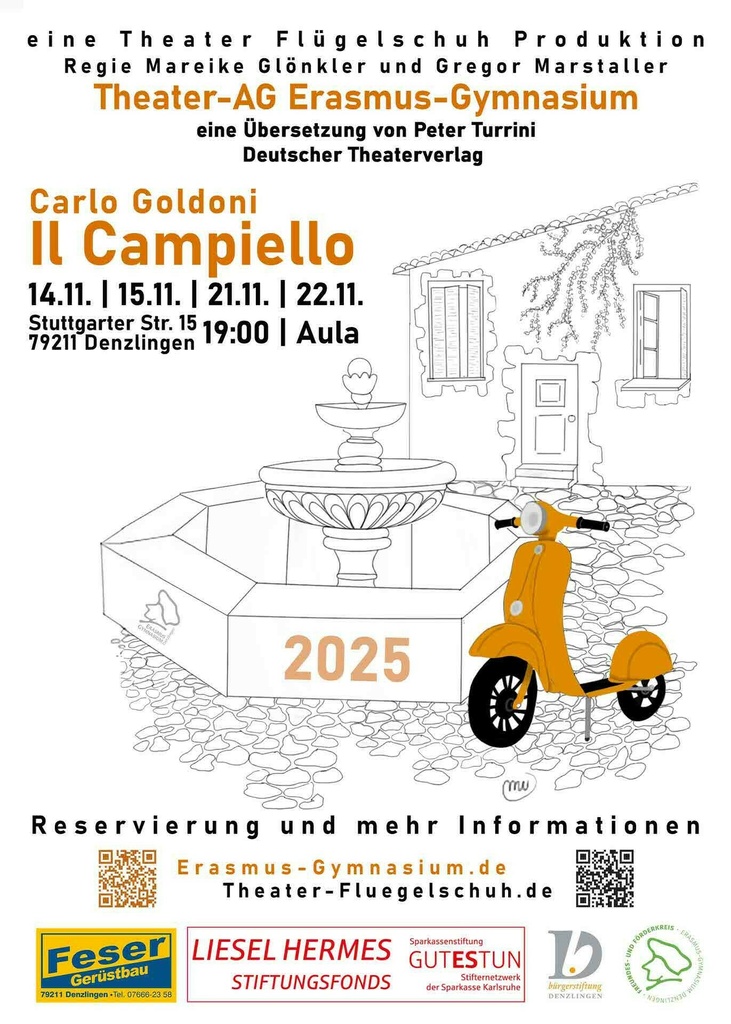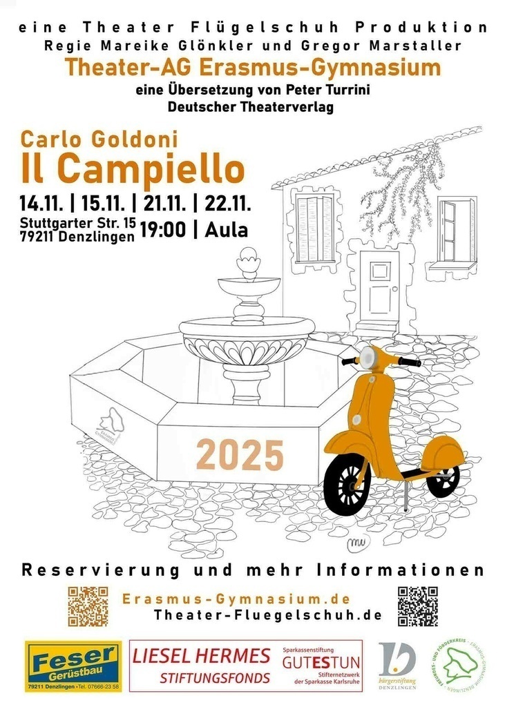 Regie: Mareike Glönkler und Gregor Marstaller Dieses Jahr wurden wir durch Liesel Hermes Stiftungsfonds, Bürgerstiftung Denzlingen und den Freundes- und Förderkreis des Erasmus-Gymnasiums Denzlingen größtenteils finanziert. Zudem konnten wir Gerüstbau Feser aus Denzlingen als Sponsor gewinnen für unsere Bühne.