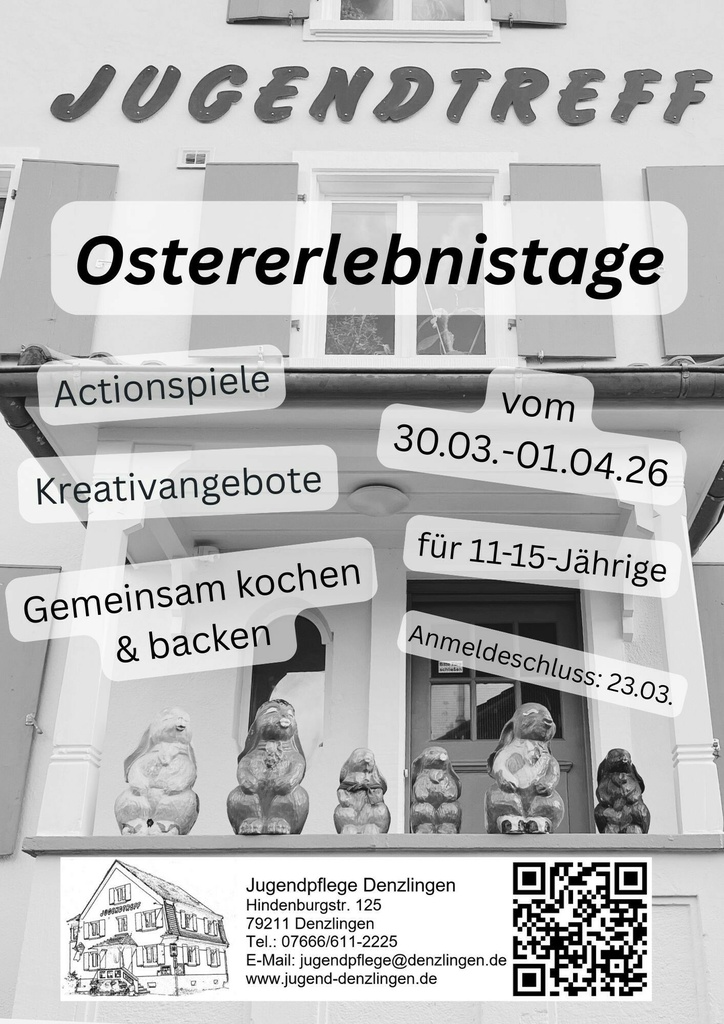 Mo, 30. März 2026 - Mi, 01. April 2026Ostererlebnistage im Jugendtreff3 Tage voller Action - die Jugendpflege Denzlingen lädt alle Jugendlichen von 11-15 Jahren zu den Ostererlebnistagen in den Jugendtreff ein.