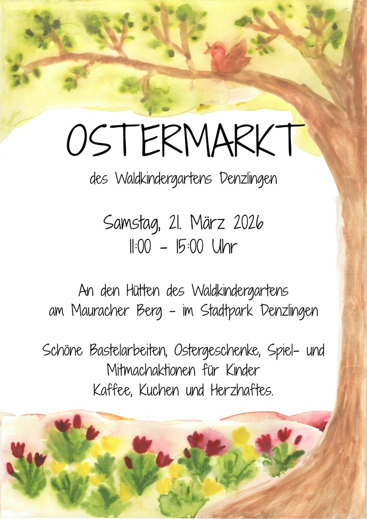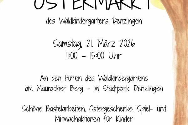 Sa, 21. März 2026 | 11:00 Uhr - 15:00 UhrOstermarkt des Waldkindergartens DenzlingenAktion Lebensraum e.V. lädt ein zum Ostermarkt an den Hütten des Waldkindergartens am Mauracher Berg im Stadtpark Denzlingen.